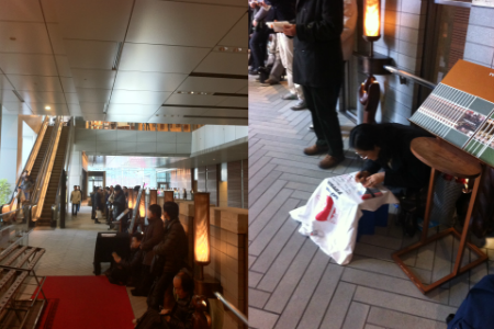 On January 22, 2012, there was a very long queue just before the door opened. That was just like the scene that I saw 3 years ago. Some were in line just looking for standing-room tickets. I asked those fans to write their own messages to Peter Cetera on a white T-shirt. Many fans readily complied with my request.